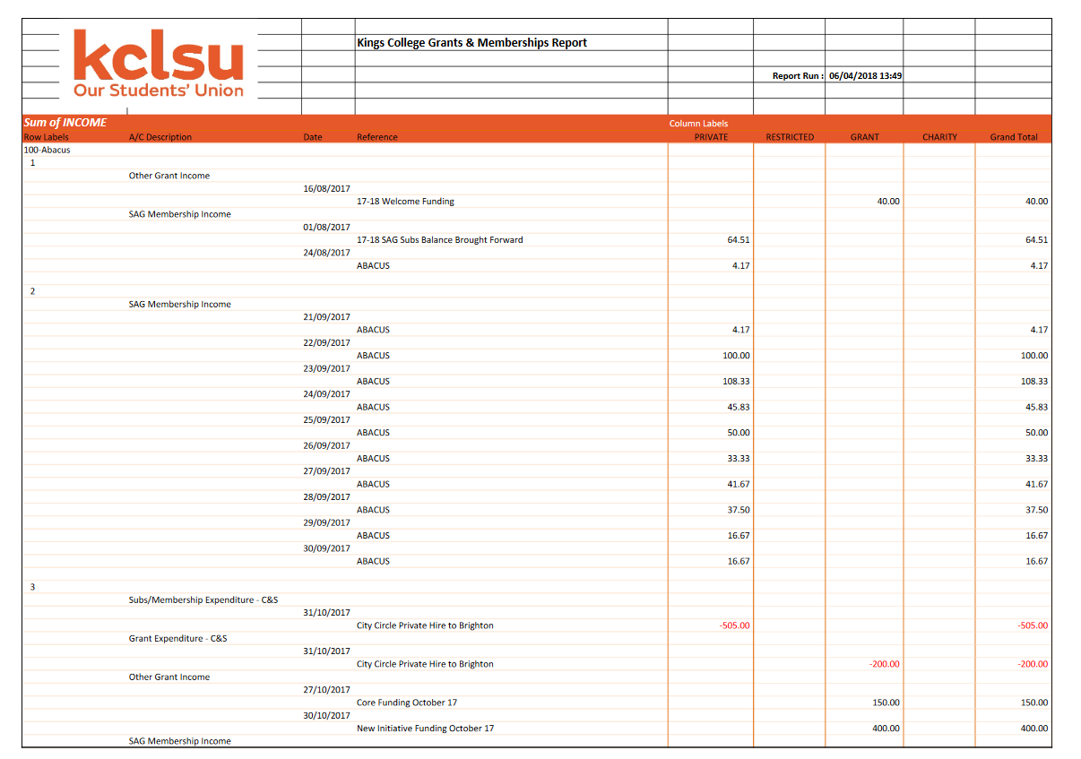 - Grant – contains KCLSU funding which your group applied for and have been awarded. Limitations apply to its use, based on the original grant application.