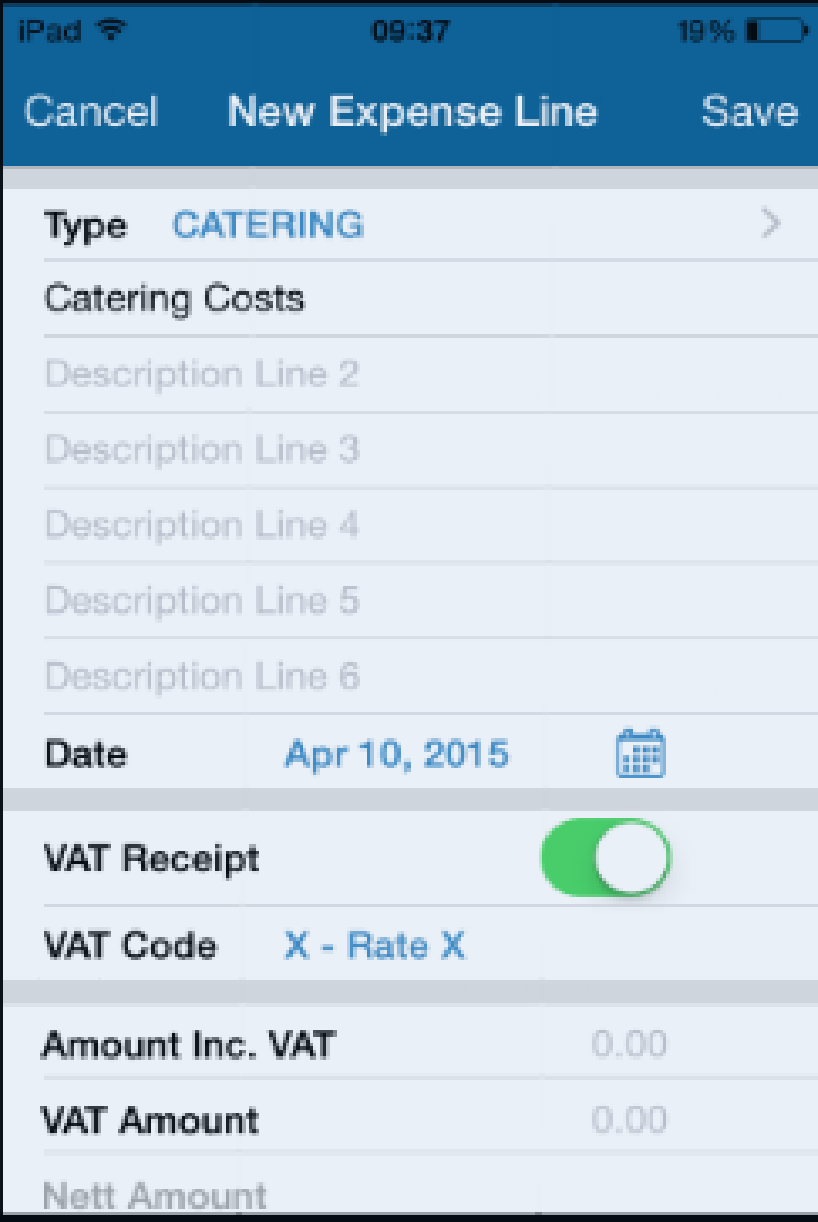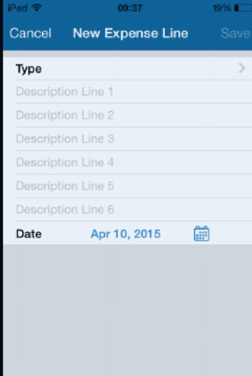 The following screens show how you can add new expenses on iOS devices.